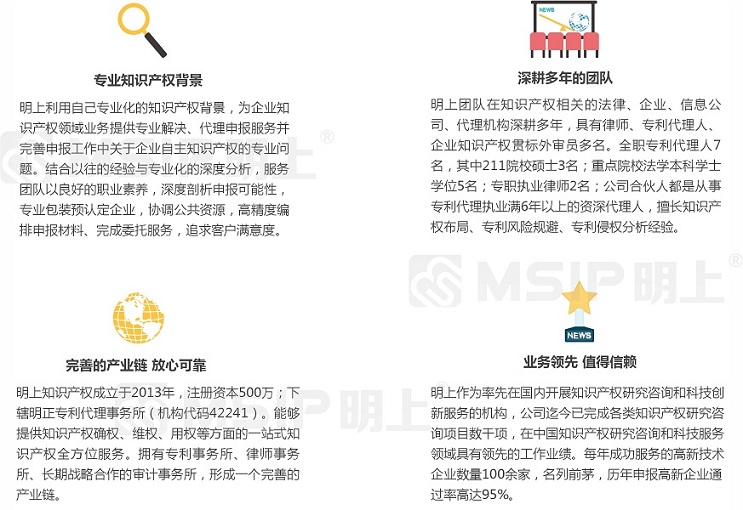 1、專業(yè)知識產(chǎn)權(quán)背景——明上利用自己專業(yè)化的知識產(chǎn)權(quán)背景,為企業(yè)知識產(chǎn)權(quán)領(lǐng)域業(yè)務(wù)提供專業(yè)解決、代理申報服務(wù)并完善雙軟認證中關(guān)于企業(yè)自主知識產(chǎn)權(quán)的專業(yè)問題。