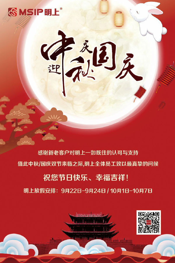 “秋色一輪滿,云衢千里明”,月圓人圓日,讓我們共享盛世美景。武漢明上知識產(chǎn)權(quán)代理有限公司、佛山明上知識產(chǎn)權(quán)服務(wù)有限公司全體員工再次向您及您的家人致以節(jié)日的祝福,恭祝您及家人中秋快樂,幸福吉祥!
