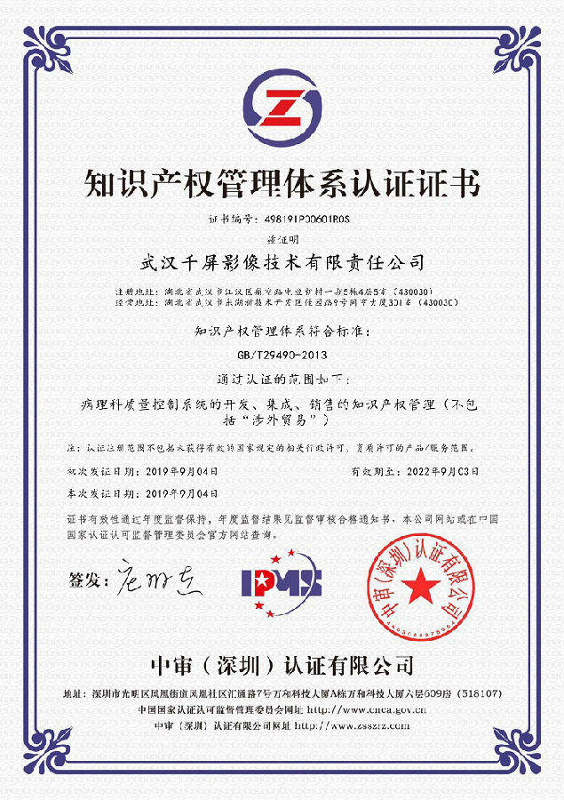 熱烈祝賀武漢千屏影像技術(shù)有限責(zé)任公司于2019年9月獲得知識產(chǎn)權(quán)貫標(biāo)認(rèn)證證書,公司在知識產(chǎn)權(quán)管理體系的建立、實(shí)施工作中取得階段性成果,意味著公司知識產(chǎn)權(quán)的規(guī)范進(jìn)入常態(tài)化。